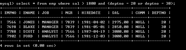 select * from emp where sal > 1800 and (deptno = 20 or deptno = 30);