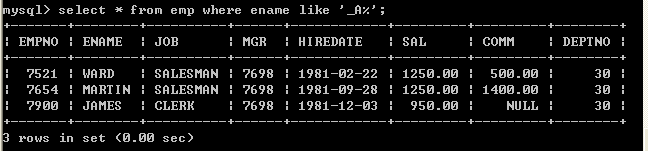 ● 查詢姓名中第二個(gè)字符為A的所有員工