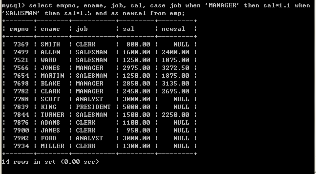 select empno, ename, job, sal, case?job when?'MANAGER' then?sal*1.1 when?'SALESMAN'?then?sal*1.5 end?as newsal from emp;