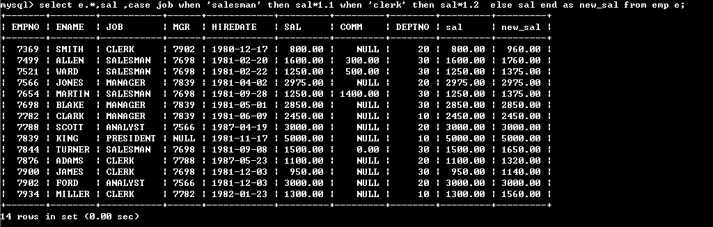 select e.*,sal ,case job when 'salesman' then sal*1.1 when 'clerk' then sal*1.2 else sal end as new_sal from emp e;