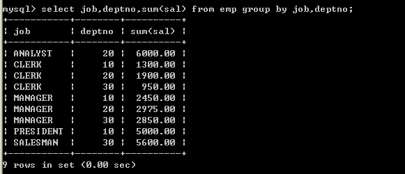 select job,deptno,sum(sal) from emp group by job,deptno;