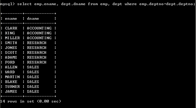 select emp.ename, dept.dname from emp, dept where