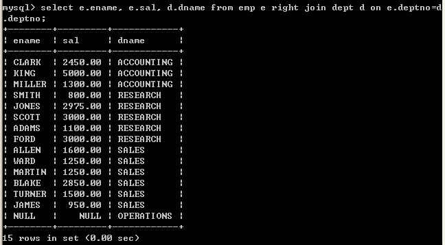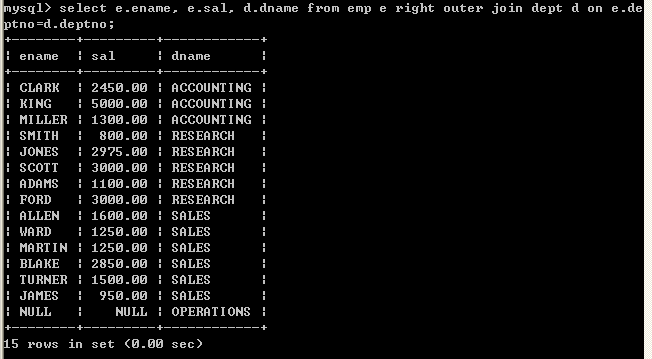 select e.ename, e.sal, d.dname from dept d left outer join emp e on e.deptno=d.deptno;
