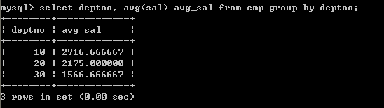 select deptno, avg(sal) avg_sal from emp group by deptno;