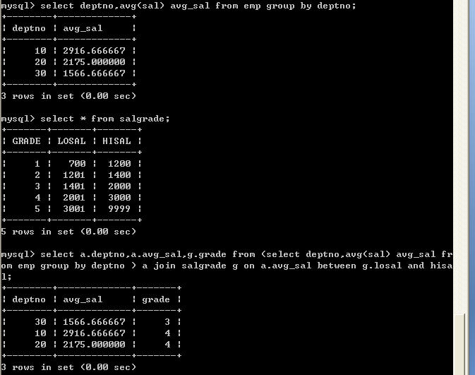 select a.deptno,a.avg_sal,g.grade from (select deptno,avg(sal) avg_sal from emp group by deptno ) a join salgrade g on a.avg_sal between g.losal and hisal;