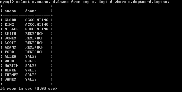 select e.ename, d.dname from emp e, dept d where e.deptno=d.deptno