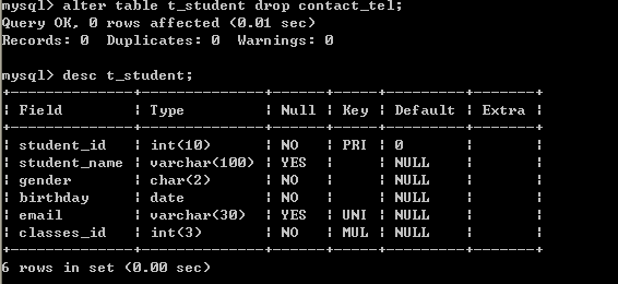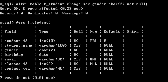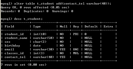 如:需求發(fā)生改變,需要向t_student中加入聯(lián)系電話字段,字段名稱為:contatct_tel 類型為varchar(40)