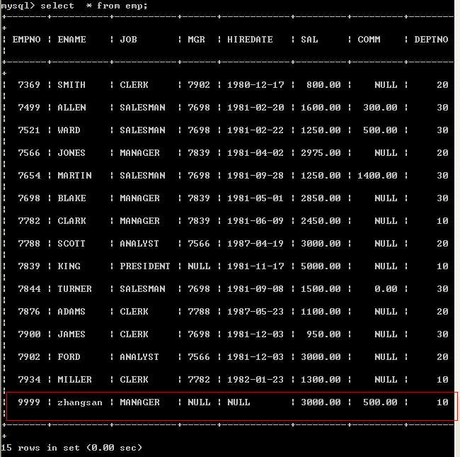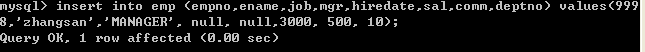 insert into emp?(empno,ename,job,mgr,hiredate,sal,comm,deptno)?values(9999,'zhangsan','MANAGER', null, null,3000, 500, 10);