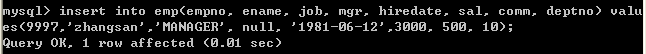 insert into emp(empno, ename, job, mgr, hiredate, sal, comm, deptno) values(9997,'zhangsan','MANAGER', null, '1981-06-12',3000, 500, 10);