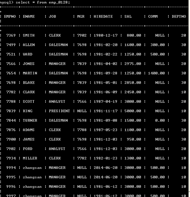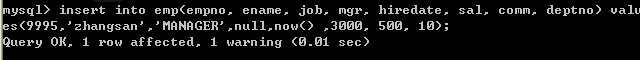 insert into emp(empno, ename, job, mgr, hiredate, sal, comm, deptno) values(9995,'zhangsan','MANAGER',null,now() ,3000, 500, 10);