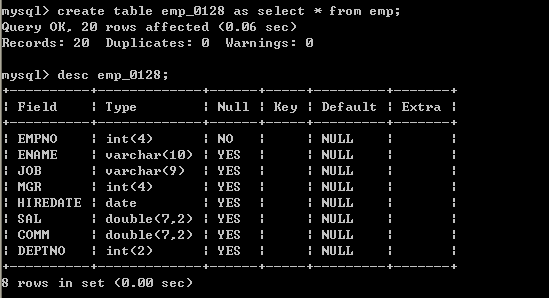 以上方式,會自動創(chuàng)建表,將符合查詢條件的數(shù)據(jù)自動復(fù)制到創(chuàng)建的表中;