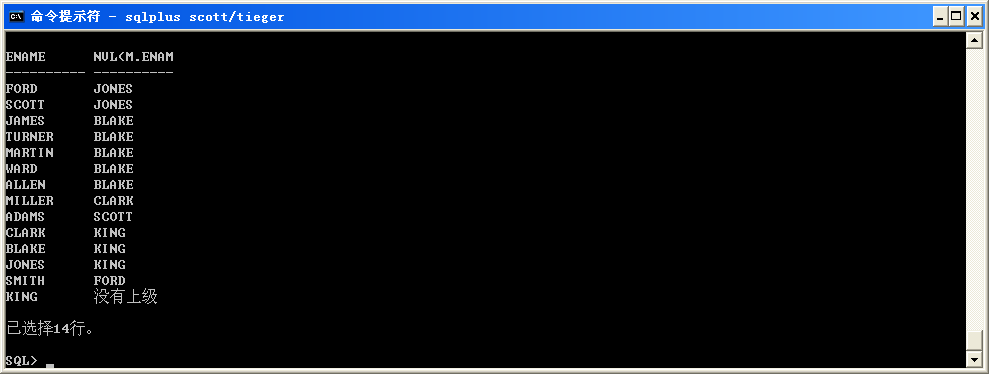 (92語法) Select e.ename, nvl(m.ename, '沒有上級') as mname from emp e, emp m where e.mgr = m.empno(+)