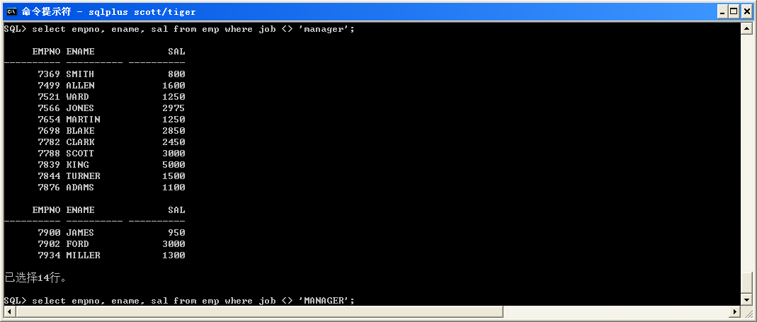 ● 查詢job不等于MANAGER并且不能與SALESMAN的員工(第二種寫法)