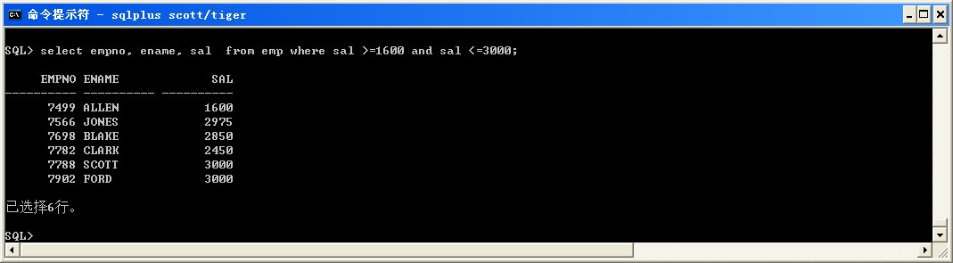 ● 查詢薪水為1600到3000的員工(第二種方式,采用between … and …)