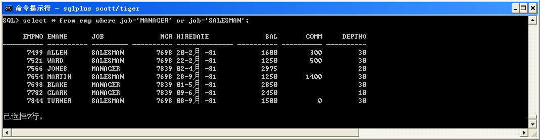 select * from emp where job='MANAGER' or job='SALESMAN';