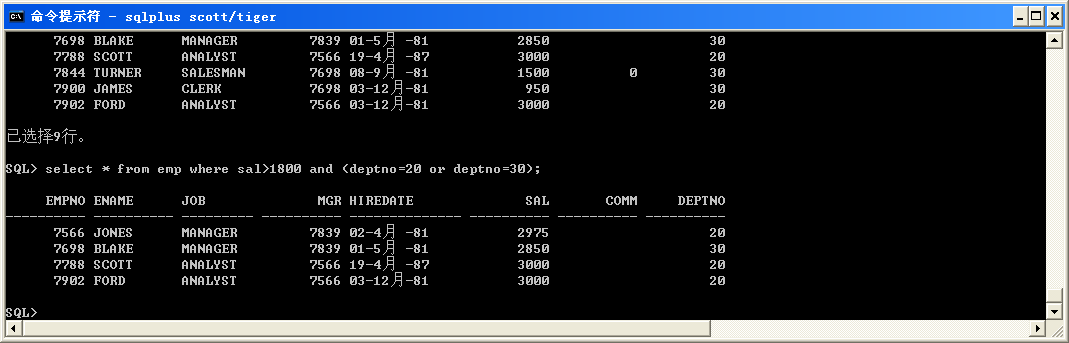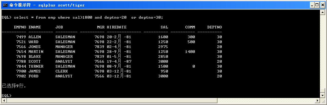 select * from emp where sal>1800 and deptno=20 or deptno=30;