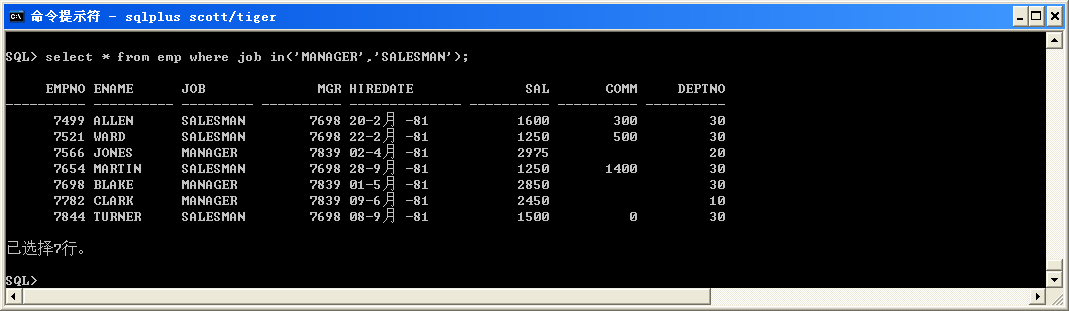 select * from emp where job in('MANAGER','SALESMAN');