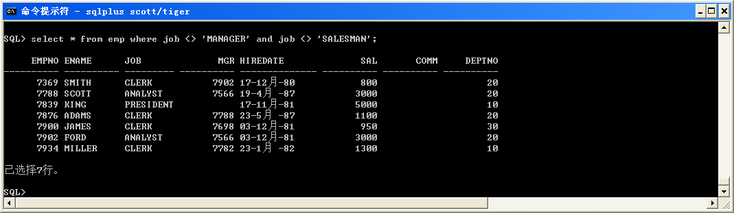 ● 查詢job不等于MANAGER并且不能與SALESMAN的員工(第一種寫法)