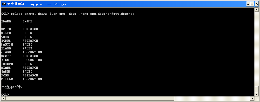 select ename, dname from emp a, dept b where a.deptno=b.deptno;