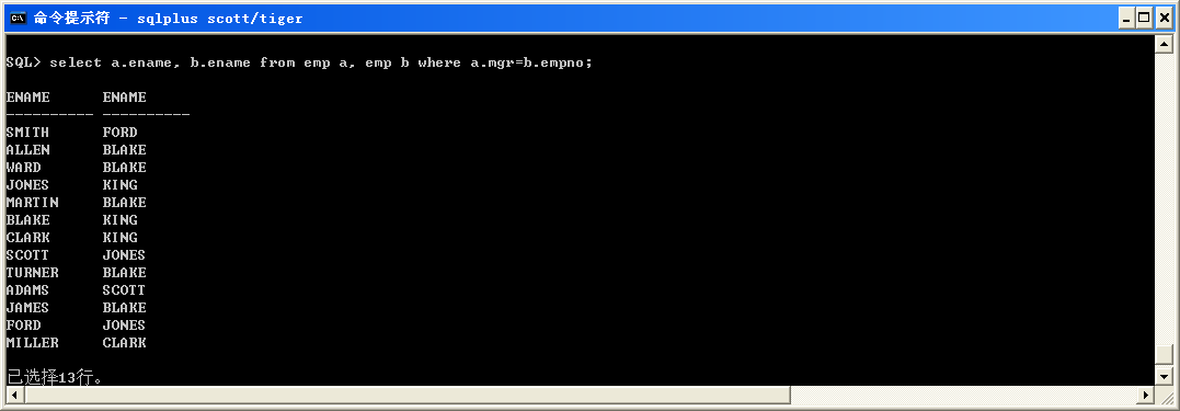 select a.ename, b.ename from emp a, emp b where a.mgr=b.empno;
