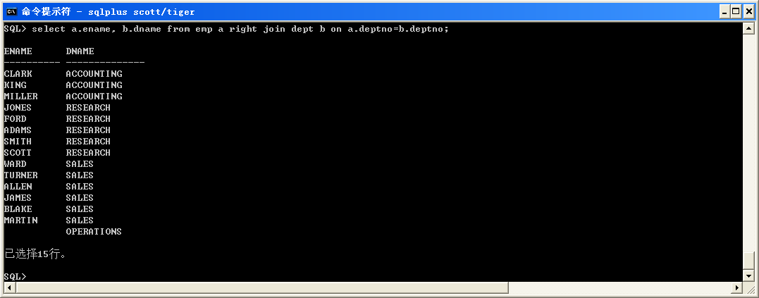 select a.ename, b.dname from emp a right outer join dept b on a.deptno=b.deptno;