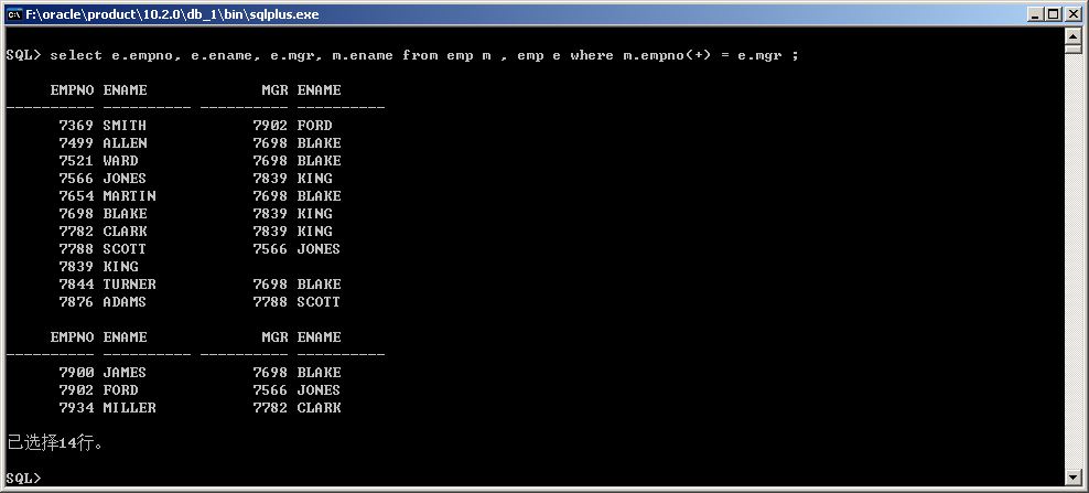 select e.empno, e.ename, e.mgr, m.ename from emp m , emp e where m.empno(+) = e.mgr ;