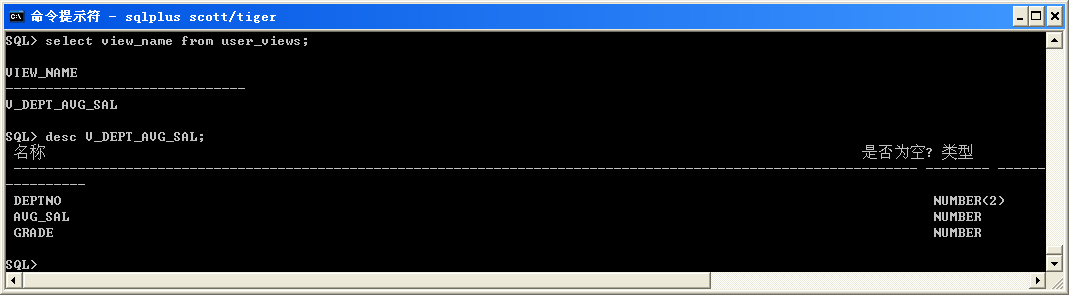 create view v_dept_avg_sal as select a.deptno, a.avg_sal, b.grade from (select deptno, avg(sal) avg_sal from emp group by deptno) a, salgrade b where a.avg_sal between b.losal and b.hisal;