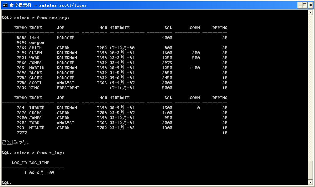 在emp中多了一條數(shù)據(jù)empno為7777,在t_log中自動加入了一條數(shù)據(jù),這就是觸發(fā)器的作用。
