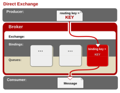 消息中的路由鍵(routing key)如果和 Binding 中的 binding key 一致, 交換器就將消息發(fā)到對應(yīng)的隊(duì)列中。路由鍵與隊(duì)列名完全匹配,如果一個(gè)隊(duì)列綁定到交換機(jī)要求路由鍵為“dog”,則只轉(zhuǎn)發(fā) routing key 標(biāo)記為“dog”的消息,不會轉(zhuǎn)發(fā)“dog.puppy”,也不會轉(zhuǎn)發(fā)“dog.guard”等等。它是完全匹配、單播的模式。