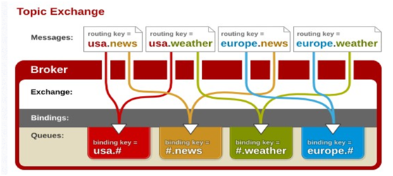 topic 交換器通過模式匹配分配消息的路由鍵屬性,將路由鍵和某個(gè)模式進(jìn)行匹配,此時(shí)隊(duì)列需要綁定到一個(gè)模式上。它將路由鍵和綁定鍵的字符串切分成單詞,這些單詞之間用點(diǎn)隔開。它同樣也會識別兩個(gè)通配符:符號“#”和符號“”。#匹配0個(gè)或多個(gè)單詞,匹配不多不少一個(gè)單詞。