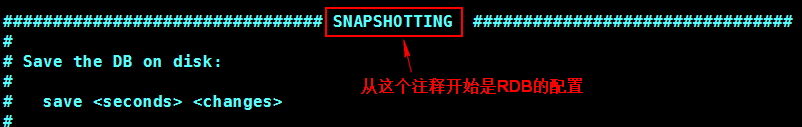 在配置文件 redis.conf 中搜索 SNAPSHOTTING, 查找在注釋開始和結(jié)束之間的關(guān)于 RDB的配置說明。配 SNAPSHOTTING 置地方有三處。