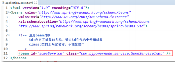 class:指定該 Bean 所屬的類,注意這里只能是類,不能是接口。