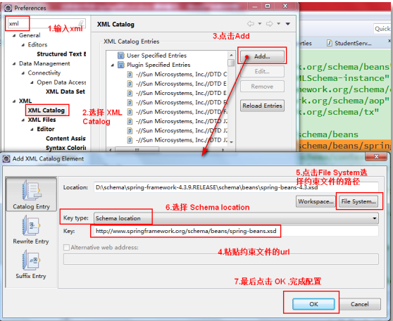注意,Spring 配置文件中使用的約束文件為 xsd 文件。若 Eclipse 中沒有自動提示功能,則需要將約束要查找的域名地址指向本地的 xsd 文件。相應(yīng)的 xsd 文件在 Spring 框架解壓目錄下的 schema 目錄的相應(yīng)子目錄中。