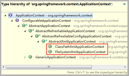 ApplicationContext 用于加載 Spring 的配置文件,在程序中充當“容器”的角色。其實現(xiàn)類有兩個。通過 Ctrl +T 查看: