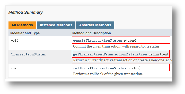 事務(wù)管理器是PlatformTransactionManager接口對象。其主要用于完成事務(wù)的提交、回滾,及獲取事務(wù)的狀態(tài)信息。