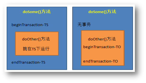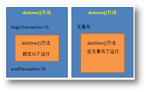 如該傳播行為加在doOther()方法上。若doSome()方法在調(diào)用doOther()方法時就是在事務(wù)內(nèi)運行的,則doOther()方法的執(zhí)行也加入到該事務(wù)內(nèi)執(zhí)行。若doSome()方法在調(diào)用doOther()方法時沒有在事務(wù)內(nèi)執(zhí)行,則doOther()方法會創(chuàng)建一個事務(wù),并在其中執(zhí)行。