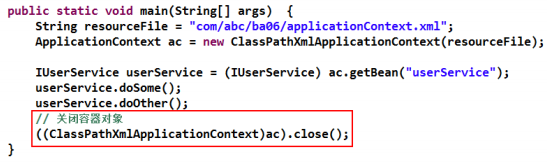 ● 要確保容器關(guān)閉。接口 ApplicationContext 沒(méi)有 close()方法,但其實(shí)現(xiàn)類有。所以,可以將 ApplicationContext 強(qiáng)轉(zhuǎn)為其實(shí)現(xiàn)類對(duì)象,或直接創(chuàng)建的就是實(shí)現(xiàn)類對(duì)象。