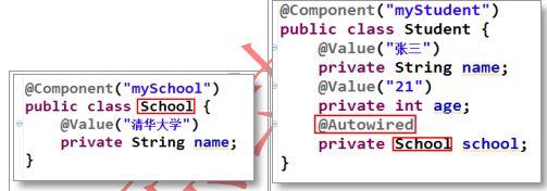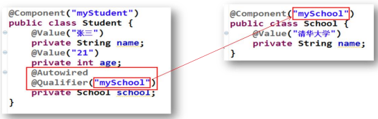 需要在引用屬性上聯(lián)合使用注解@Autowired 與@Qualifier。@Qualifier 的 value 屬性用于指定要匹配的 Bean 的 id 值。同樣類中無需 setter,也可加到 setter 上。