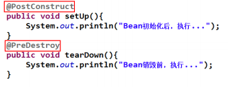 在方法上使用@PostConstruct 與原來的 init-method 等效。在方法上使用@PreDestroy,與 destroy-method 等效。