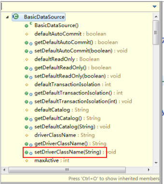 DBCP 數(shù)據(jù)源是 BasicDataSource,Ctrl + O 查看其類結(jié)構(gòu)可看到,其有 driverClassName、url、username、password 四個 DB 連接屬性。