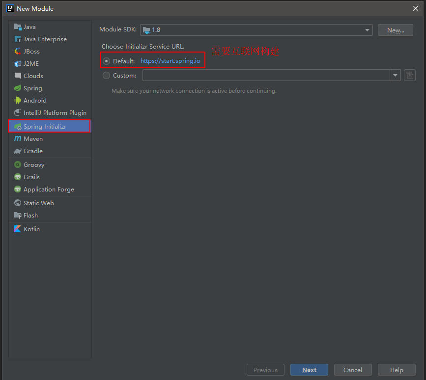 1.創(chuàng)建一個Module,選擇類型為Spring Initializr快速構建