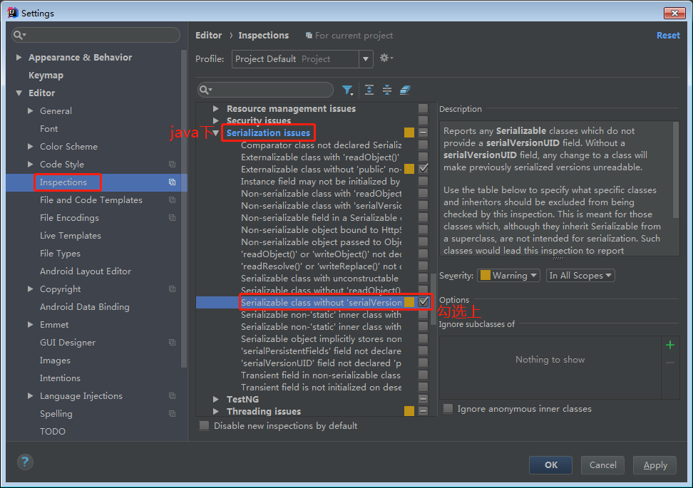 ⑧ 讓Student類實現(xiàn)序列化接口(可選)在類名上Alt + 回車,如果沒有提示生成序列化id,那么需要做如下的配置