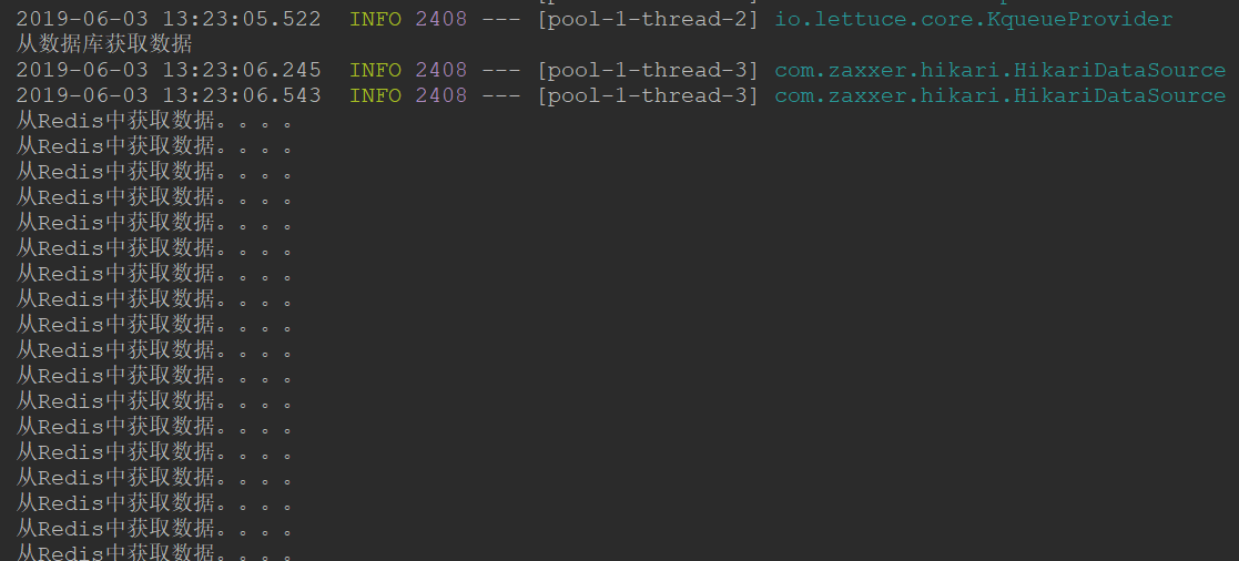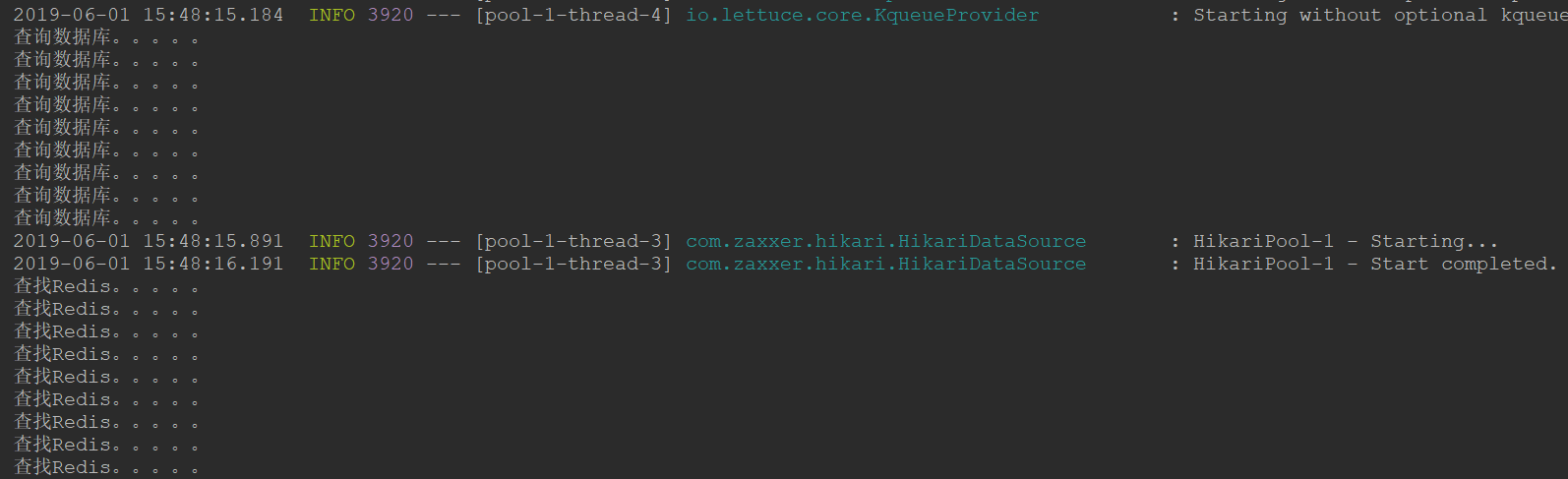 2. 啟動應用程序,瀏覽器訪問測試,查看控制臺輸出只有第一個線程查詢數(shù)據(jù)庫,其它線程查詢Redis緩存,這樣的解決的小問題就是第一批進來的用戶會有一個等待,但是這樣的影響可以忽略。