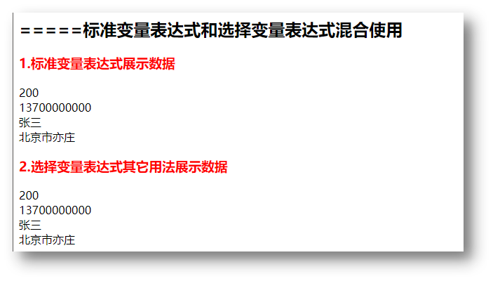 標(biāo)準(zhǔn)變量表達(dá)式和選擇變量表達(dá)式可以混合一起使用, 也可以不使用 th:object 進(jìn)行對象的選擇,而直接使用 *{...} 獲取數(shù)據(jù)