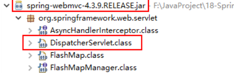 該中央調(diào)度器為一個 Servlet,名稱為 DispatcherServlet。中央調(diào)度器的全限定性類名在導(dǎo)入的 Jar 文件 spring-webmvc-4.3.9.RELEASE.jar 的第一個包 org.springframework.web.servlet下可找到。