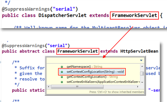 打開 DispatcherServlet 的源碼,其繼承自 FrameworkServlet,而該類中有一個屬性contextConfigLocation,用于設(shè)置 SpringMVC 配置文件的路徑及文件名。該初始化參數(shù)的屬性就來自于這里。