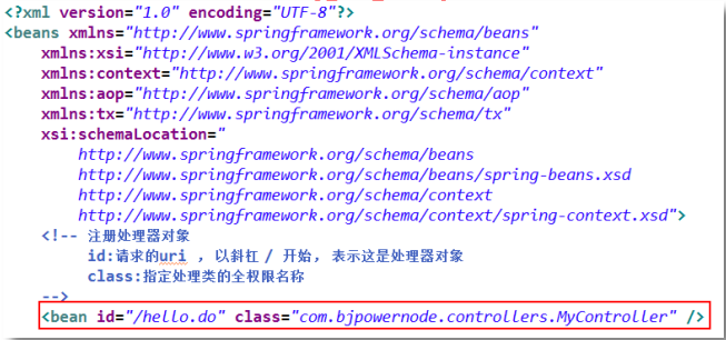 在 springmvc.xml 中注冊處理器。不過,需要注意處理器的 id 屬性值為一個請求 URI。表示當(dāng)客戶端提交該請求時,會訪問 class 指定的這個處理器。