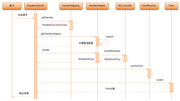 (6)處理器將處理結(jié)果及要跳轉(zhuǎn)的視圖封裝到一個(gè)對(duì)象 ModelAndView 中,并將其返回給處理器適配器。