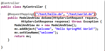若有多個(gè)請(qǐng)求路徑均可匹配該處理器方法的執(zhí)行,則@RequestMapping 的 value 屬性中可以寫上一個(gè)數(shù)組。