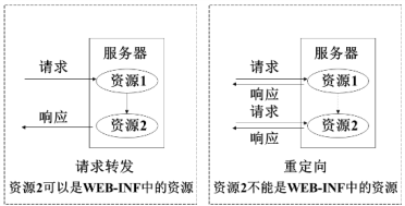 注意,對于請求轉(zhuǎn)發(fā)的頁面,可以是WEB-INF中頁面;而重定向的頁面,是不能為WEB-INF 中頁的。因為重定向相當(dāng)于用戶再次發(fā)出一次請求,而用戶是不能直接訪問 WEB-INF 中資源的。